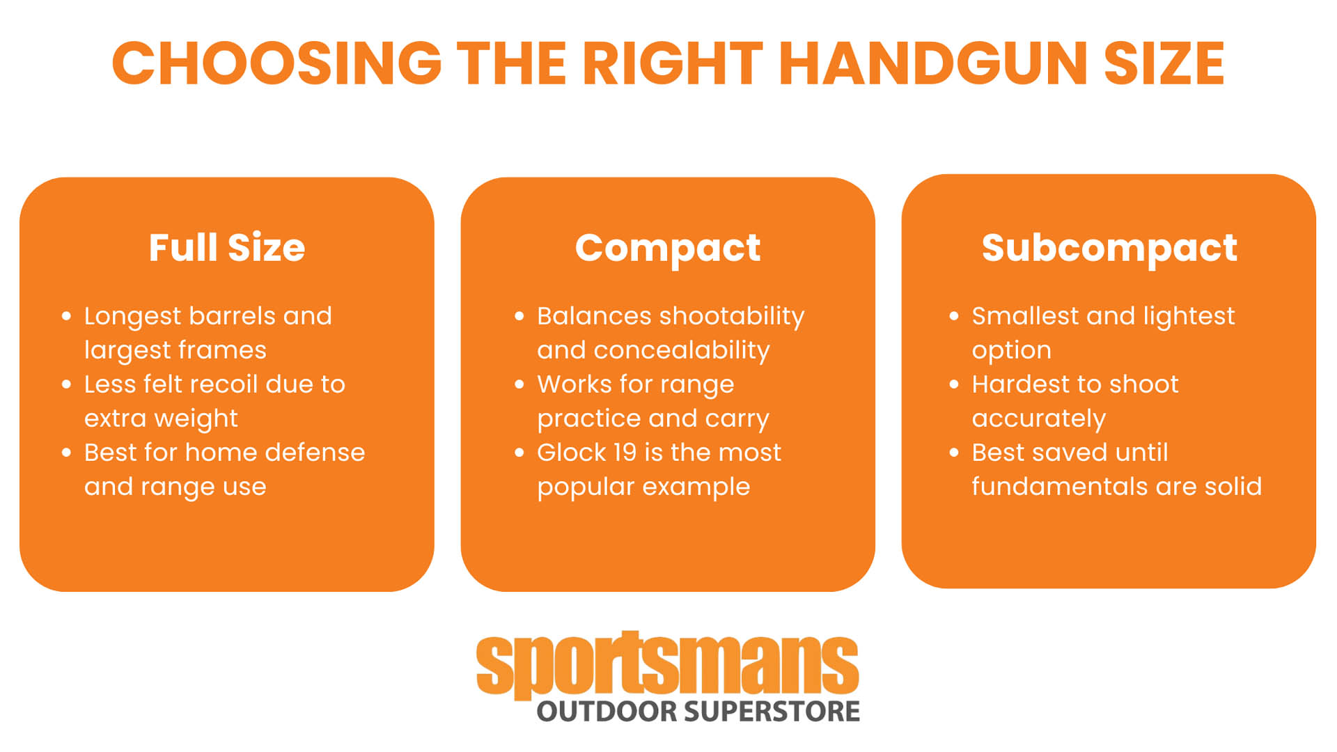 Full size handguns have longer barrels and larger frames. They are the easiest to shoot well. More weight means less felt recoil. A longer sight radius makes aiming easier. If home defense or range shooting is your goal, start here.
