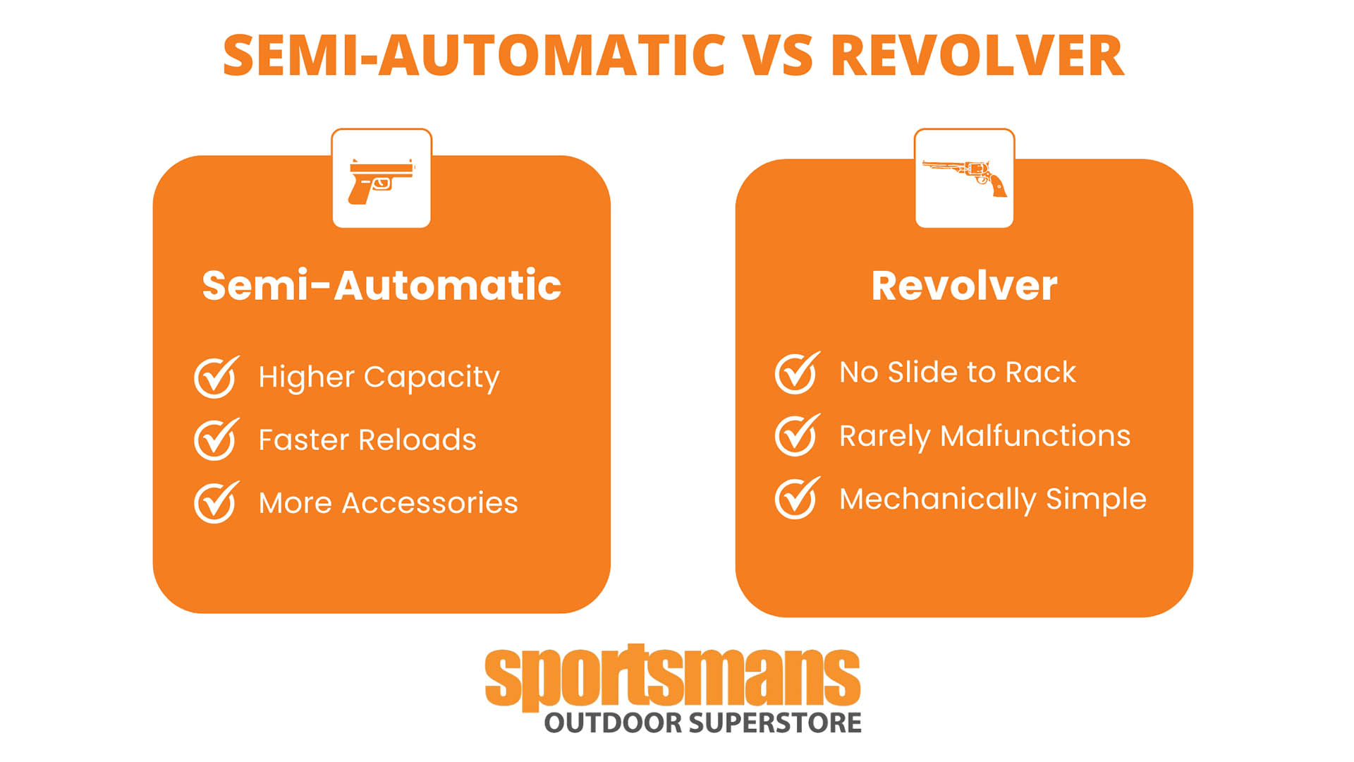 Handguns fall into two main categories: semi-automatic pistols and revolvers. Both have their place, but they work differently.