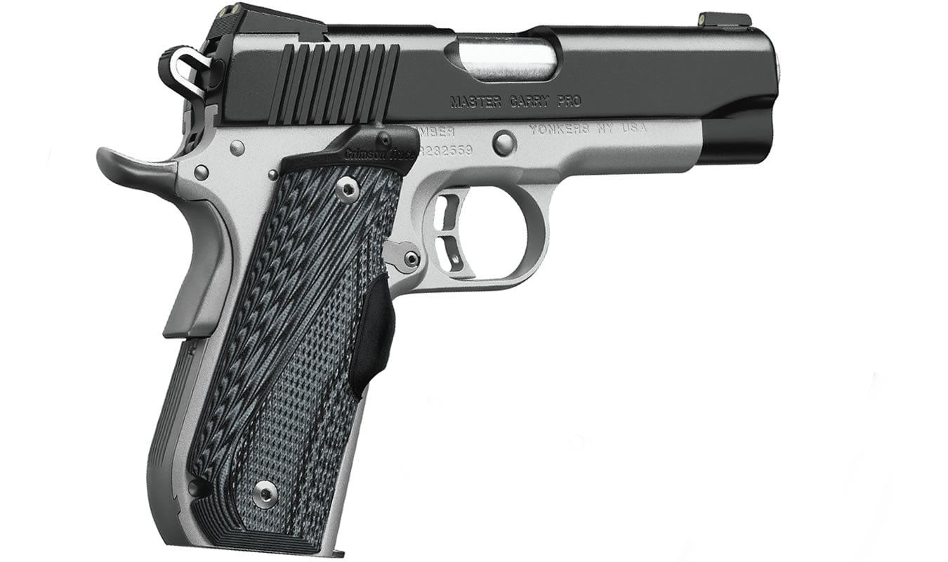 Ideal for concealed carry, the Master Carry Pro 9mm has a lightweight aluminum Round Heel Frame, matte black KimPro II slide finish, and wears Crimson Trace Master Series Lasergrips.