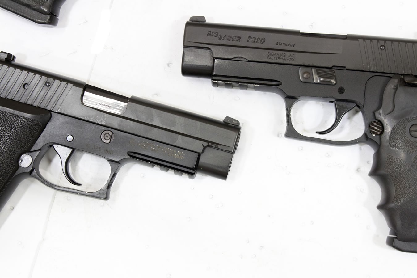 The photo represents the overall condition of these Sig Sauer P220R DAK police trades, all of which are in fair condition.