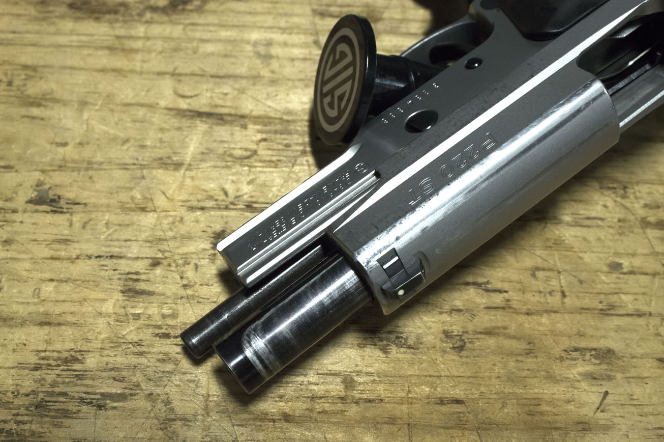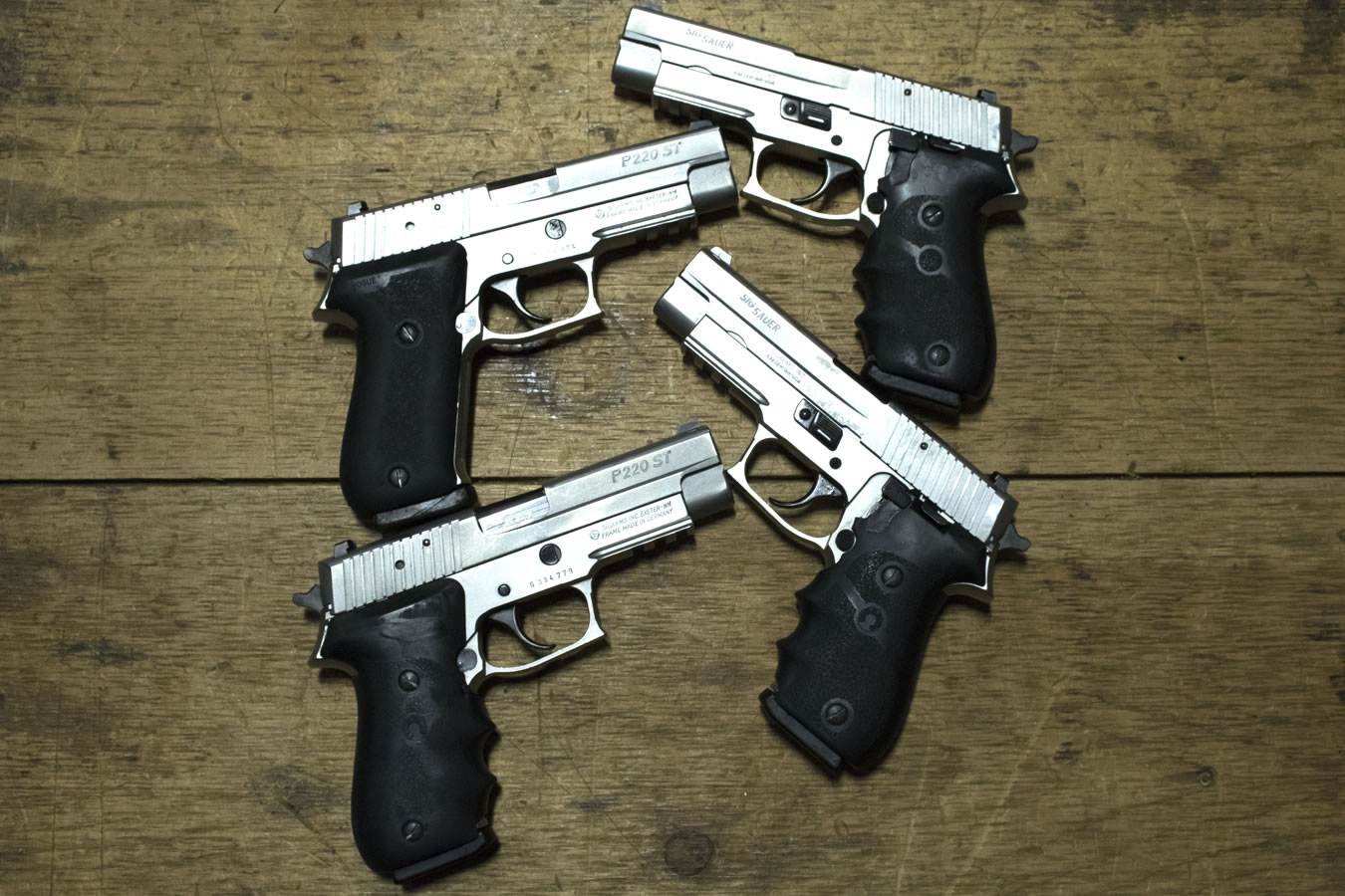 The photo represents the overall condition of these Sig Sauer P220 ST police trades, all of which are in good condition.