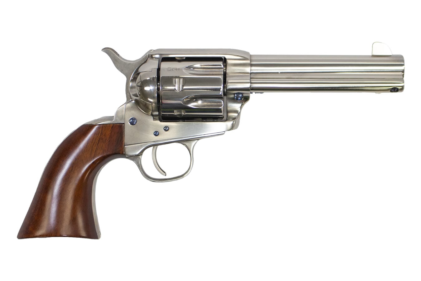 The single-action Army was most widely produced with a color case-hardened frame and blued barrel. Meanwhile, a nickel-plated version was issued to Indian scouts. And a bright charcoal blue finish was available from the factory. But with years of use, the old 6-guns took on a well-handled soft gray patina. All of these classic finishes are available in the 1873 Cattleman.