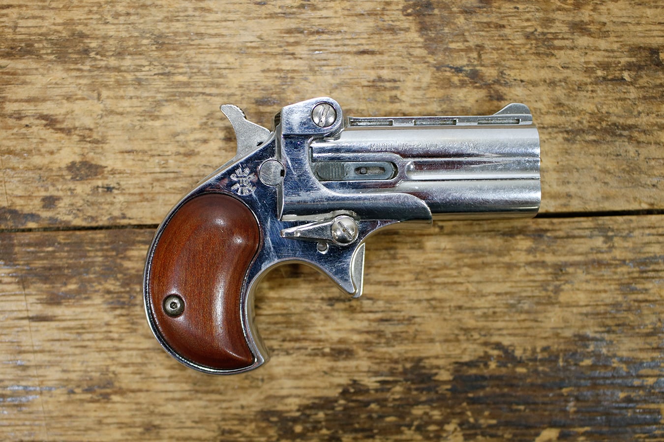 These photos represent the exact firearm for sale, a Davis DM-22 22 WMR Derringer with wood grips.
