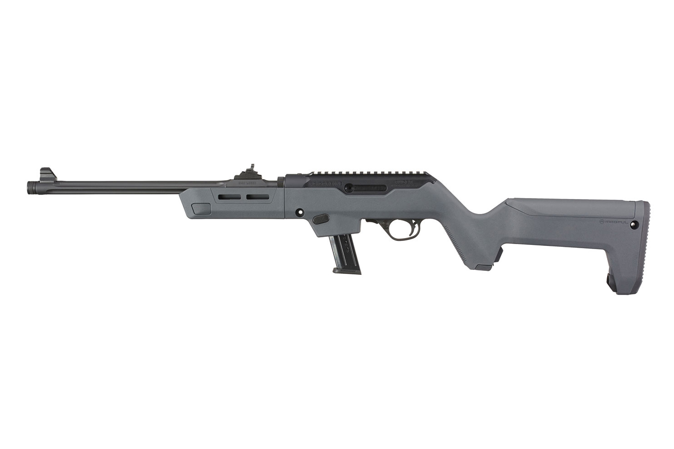 Ruger's Offering of the takedown PC Carbine in a Stealth-Gray colored Magpul® PC Backpacker stock. This stock features an ergonomic handguard, optional QD sling mounting capability, integrated storage compartment in the grip, a hinged storage compartment in the stock capable of storing spare magazine, an MOE SL® non-slip rubber buttpad, and a unique locking interface to attach the barrel assembly to the receiver when being transported.