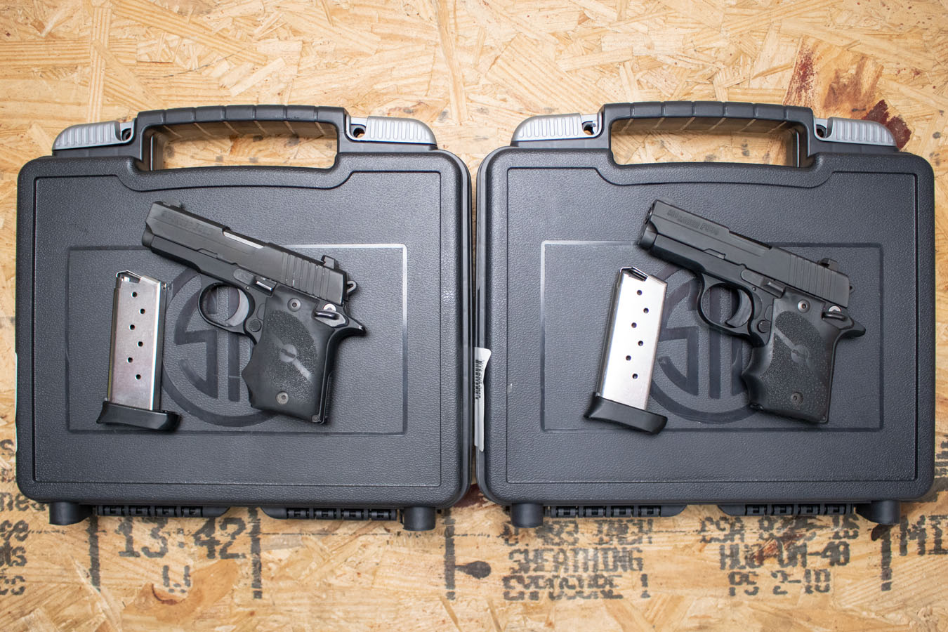 These photos represent the general condition of the firearms for sale, Sig Sauer P938 9mm Semi-Auto Pistols with Manual Safeties, Factory Hard Case, and in Good Condition. The price is for 1 firearm.