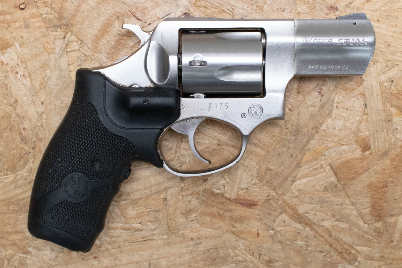 These photos represent the general condition of the firearm for sale, a Ruger SP101 .357 Magnum Stainless Revolver with Crimson Trace Lasergrips. The price is for 1 firearm.