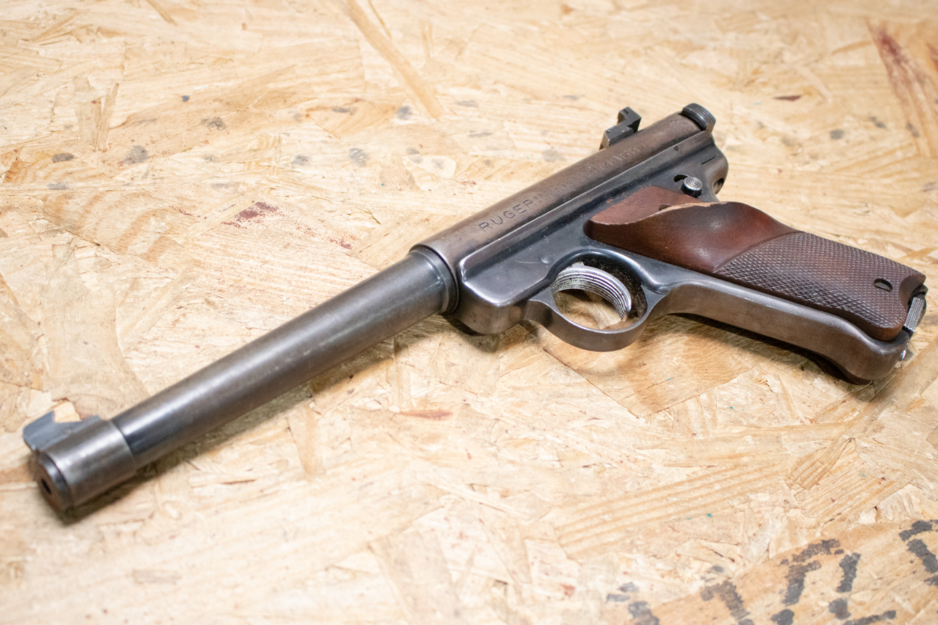 These photos represent the general condition of the firearm for sale, a Ruger Mark I .22LR Semi-Auto Pistol with Contoured Wood Grips and Bull Barrel. The price is for 1 firearm.