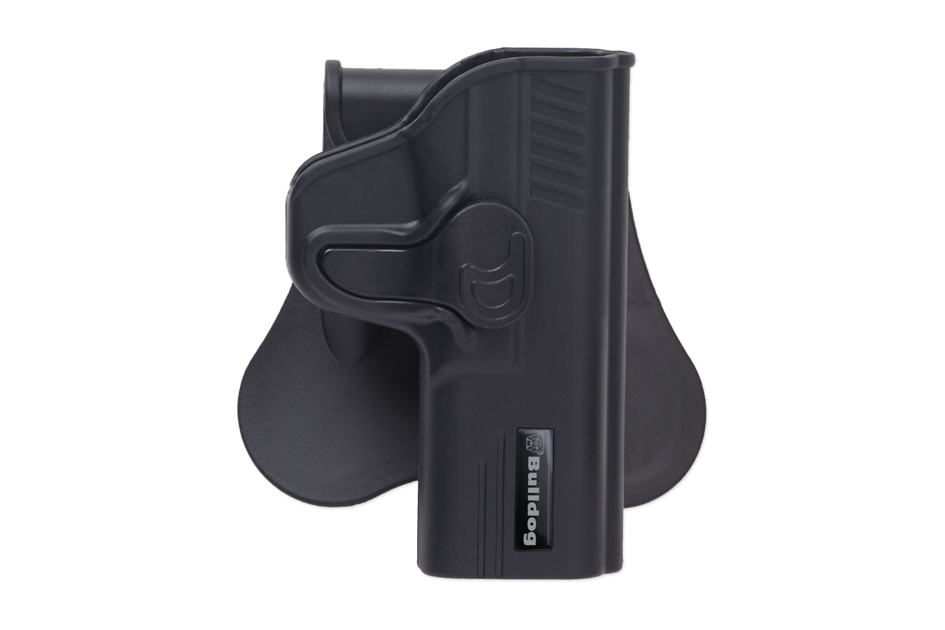 Bulldog's Rapid Release Holster is suitable for civilian, duty and military use. The holster is made of durable, high-tech polymer material with gun-specific design that is fully adjustable to multiple draw positions. Its specially designed locking mechanism provides safe and secure "Level II" retention while offering a one finger "Quick Draw" release.