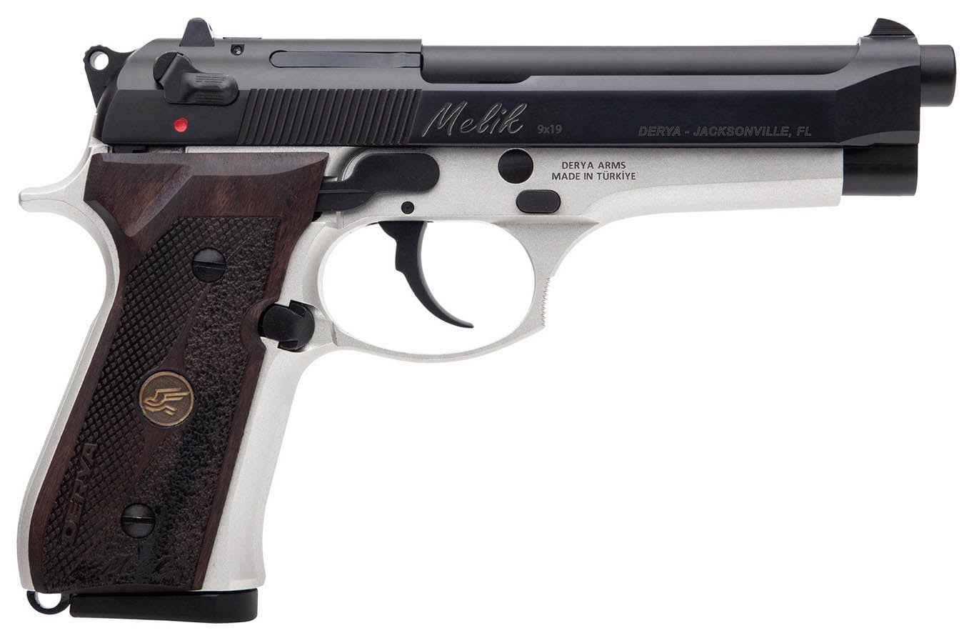 The Derya Melik 9 mm pistol features an eye-catching two-tone look—silver-anodized aluminum frame paired with a black Melonite steel slide. Its recoil-delayed, double-/single-action design is complemented by dark walnut grips, a 17-round magazine, and fixed sights for dependable accuracy. Each pistol ships with a hard case, cleaning kit, manual, and WTTA flyer.